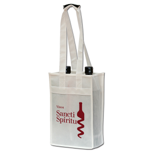 Are you looking for a business gift that will present your logo in useful way? Two bottle wine tote, B310, made for 90 GSM polypropylene make a great way to tote vino home from the store or wine shop. Also make great business gifts or favors at an event. Large imprint area, 5 x 5 inches, and available in burgundy, black or white. Prices start at 1.79 ea for 150 pieces, 1.74 ea for 300 and 1.69 ea. for 600 pieces, 1.64 for 1200 pieces and 1.59 for 2400 pieces. 5 x 5″ imprint area, one color, one location. Screen set up is 50.00 one time. Light to ship, this item is sure to be popular item at any tradeshow or event. 4 and 6 bottle totes also available for additional.